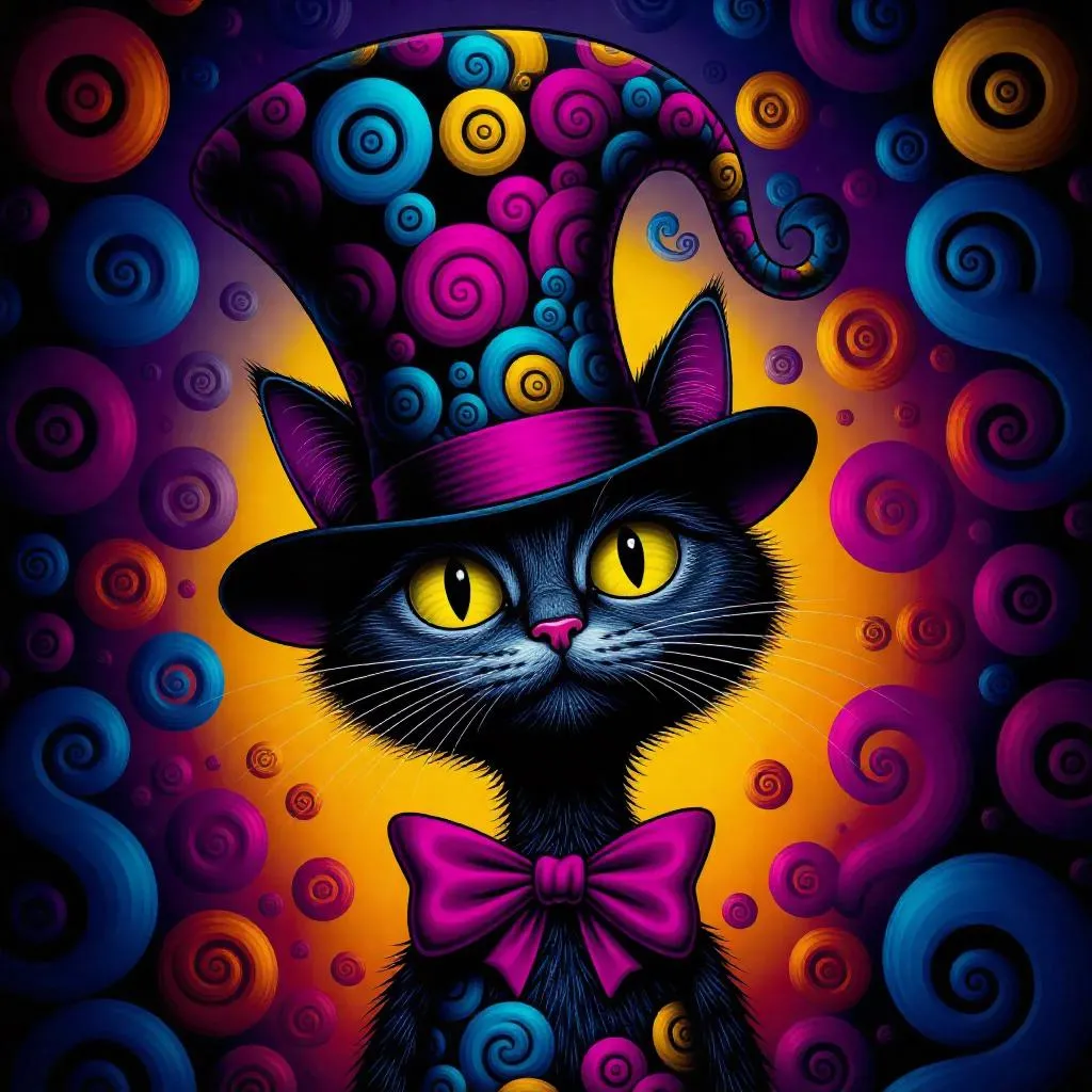 A whimsical and surreal scene featuring the cat in the hat, Abnermal, with a striking color palette of gray, dark-gray, purple, blue, and yellow. The cat's iconic hat is adorned with vibrant, swirling patterns, and the background is a dreamlike blend of abstract shapes and colors, enhancing the otherworldly atmosphere.