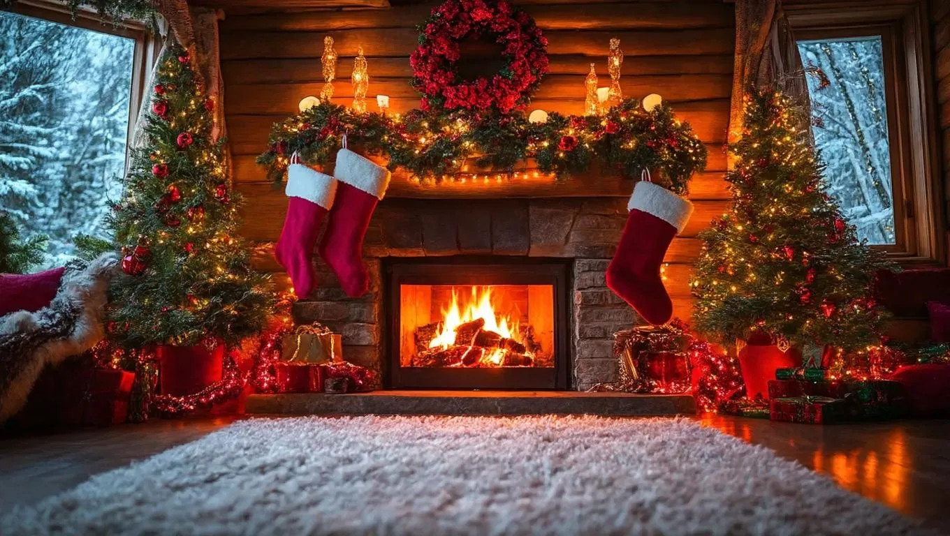 Experience a cozy home interior with a crackling fireplace emitting a soft orange glow. Christmas decor—red/green wreaths, twinkling lights, stockings—enhances the warm, inviting atmosphere. Plush carpet and soft lighting create a peaceful vibe. Perfect AI-generated scene for holiday warmth and relaxation.
