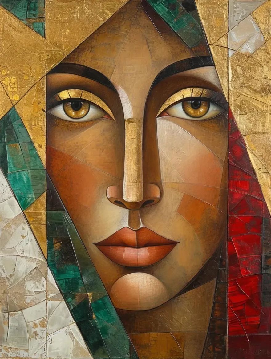 Generate a Byzantine Cubism-inspired AI artwork of a V-shaped brown female figure with a sweet face. Transparent red, green, and yellow hues blend with gold accents, capturing the era's ornate style. Features distorted perspectives, white nacar textures, and striking ogive-shaped yellow eyes. Ideal for AI image generation blending historical art with abstract, vibrant creativity.