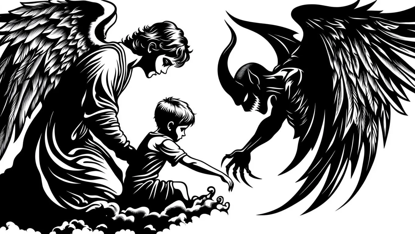 Generate a dramatic black-and-white tattoo stencil design with AI: an angel rescuing a boy trapped by a sinister Satan-like figure. Perfect for symbolic, high-contrast body art. Explore AI-powered creativity for striking spiritual imagery, intricate details, and professional-grade stencil effects.