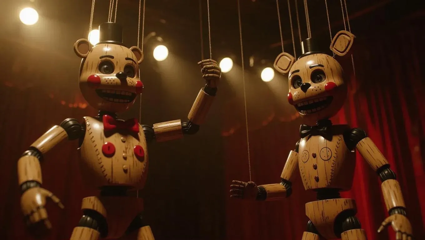 Close-up shot of two marionettes on stage: Freddy from Five Nights at Freddy’s, and the Doll from Squid Game, both puppets suspended by clearly visible strings attached to their hands. The wooden stage is dimly lit by dramatic spotlights from above, casting long shadows. The background shows faint outlines of red velvet curtains and a dark theater audience. The mood is eerie and tense, with cinematic lighting, ultra-detailed textures, 4K quality, soft depth of field. Camera slowly zooms in towards the marionettes, emphasizing the tension and the strings’ movement.