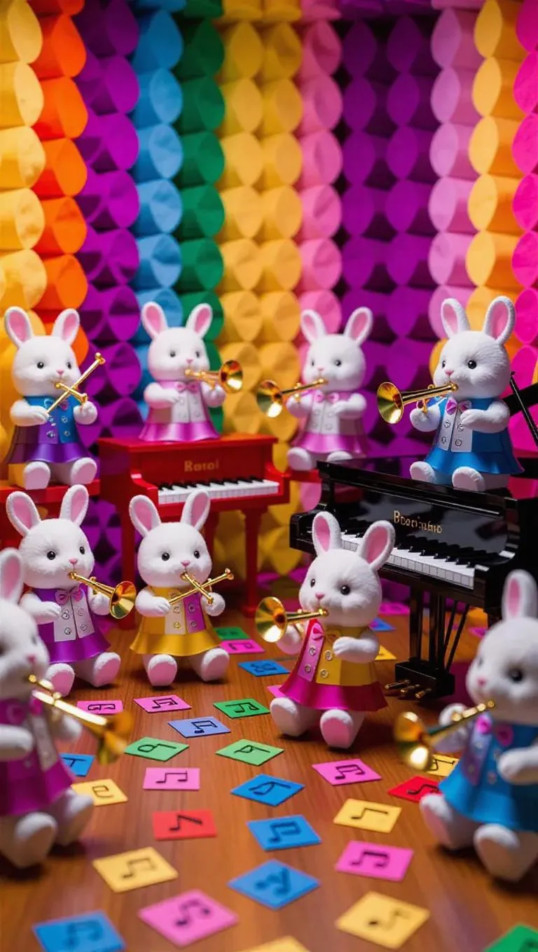 Discover AI-generated thick CG-style art of a lively toy factory soundroom. Vibrant music toys like piano dolls, trumpet bears, and violin rabbits shine in 4K resolution. Rich textures highlight metallic instruments and plush fur, while harmonious colors and detailed acoustic sponge walls ensure professional precision. Perfect blend of whimsical creativity and ultra-clear visual storytelling for digital art enthusiasts.