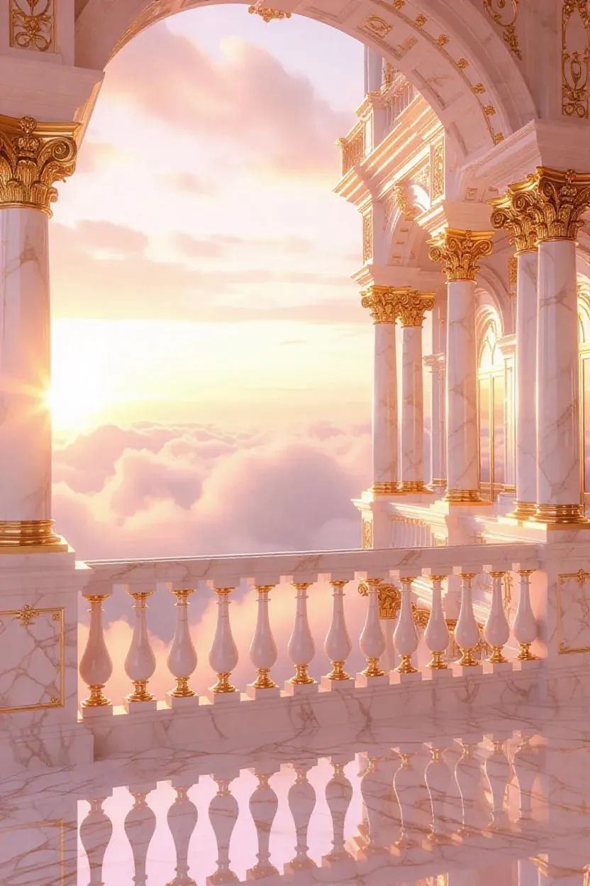 A luxurious marble balcony with golden railings, overlooking a floating palace above the clouds at sunset, soft pastel sky, warm glowing light, dreamy fantasy atmosphere, intricate details, ultra-detailed, Polyart model, portrait 2:3, ethereal mist, shimmering stars, elegant drapery, ornate balustrades, serene ambiance.