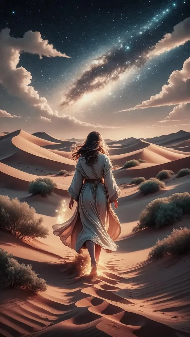 Transform text into mesmerizing AI videos with VivaGo. Depict a robed girl wandering a star-lit desert night, wind whispering through dunes, residual heat shimmering. Capture swirling sand clouds, sparse vegetation, and 4-minute cinematic allure. Elevate prompts into professional-grade visuals with AI-powered precision.