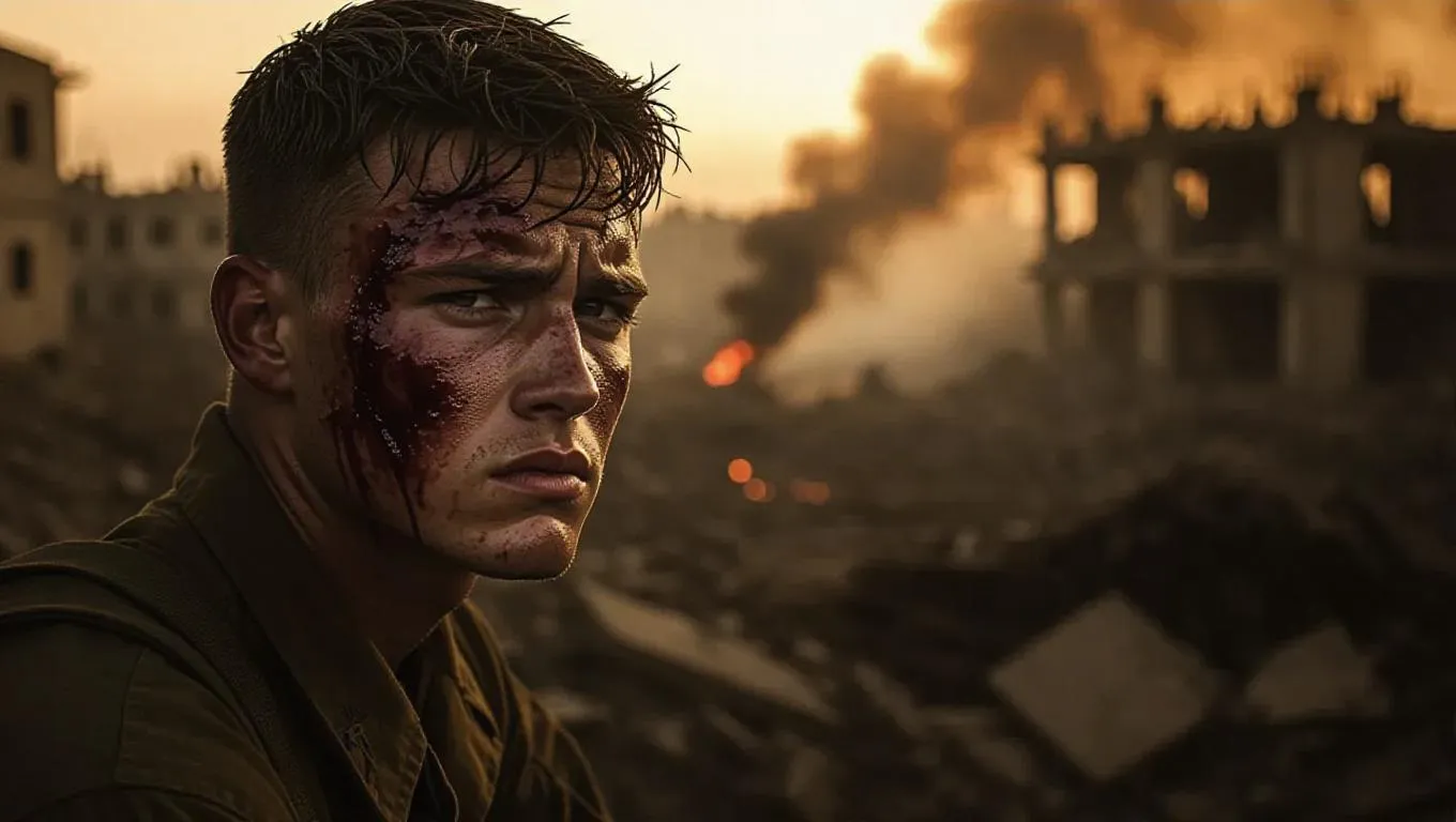 A weary soldier, gazing intensely with deep sorrow, his face etched with the brutal scars of war, standing amidst a backdrop of ravaged buildings and smoldering ruins, rubble and debris scattered around him, dark smoke billowing into the desolate sky, the late afternoon sunlight casting long shadows, illuminating his weathered features with a mix of warm golden tones and cool shadows, a 50mm f/1.4 lens focused on his expressive face from a 3/4 view, high contrast and detailed textures rendered in a hyper-realistic style, using a full-frame camera body.