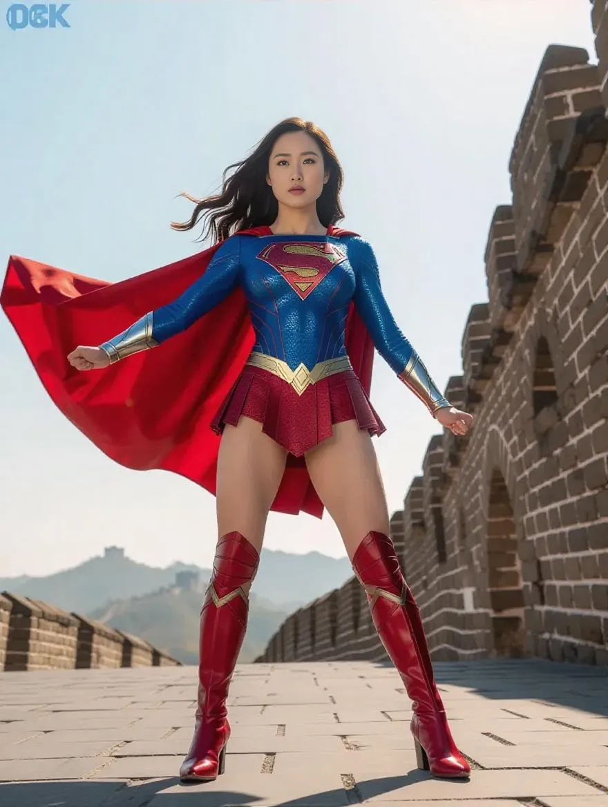 Experience AI-generated Supergirl in 4K HDR 60fps: China Girl heroine in red-blue leotard, shield chest emblem, flowing cape, and boots saves Beijing's Great Wall. Stunning full-body mirror shot captures sky-flying crossed-leg pose from afar to close-up. Perfect AI video effects for dynamic superhero visuals. Elevate content with AI-powered realism for action-packed storytelling.