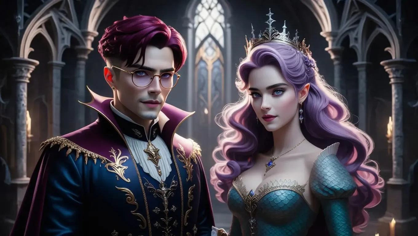 Create captivating AI-generated art of Gothic royalty in dark fantasy anime style. A supernatural queen with light purple hair (half-vampire, half-mermaid) and a king (half-reaper, half-phantom) with maroon hair and glasses. Perfect for dark fantasy enthusiasts seeking unique hybrid character designs. Explore Vivago.ai’s tools for mystical, edgy visuals.