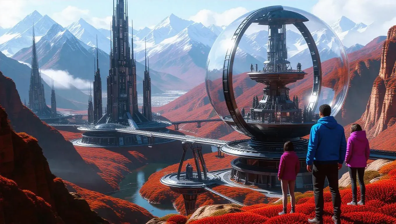 A breathtaking panorama of a multi-level futuristic metropolis nestled among picturesque mountains and valleys, with dense red-orange vegetation. The city's architecture blends bold skyscrapers and organic designs, connected by intricate transport networks. At the focal point, a large transparent spherical capsule suspended on slender supports. Inside, four figures: one in a blue jacket and dark trousers facing away, two standing sideways in a pink jacket and light clothes, and a partially visible fourth figure, all gazing at the awe-inspiring cityscape.