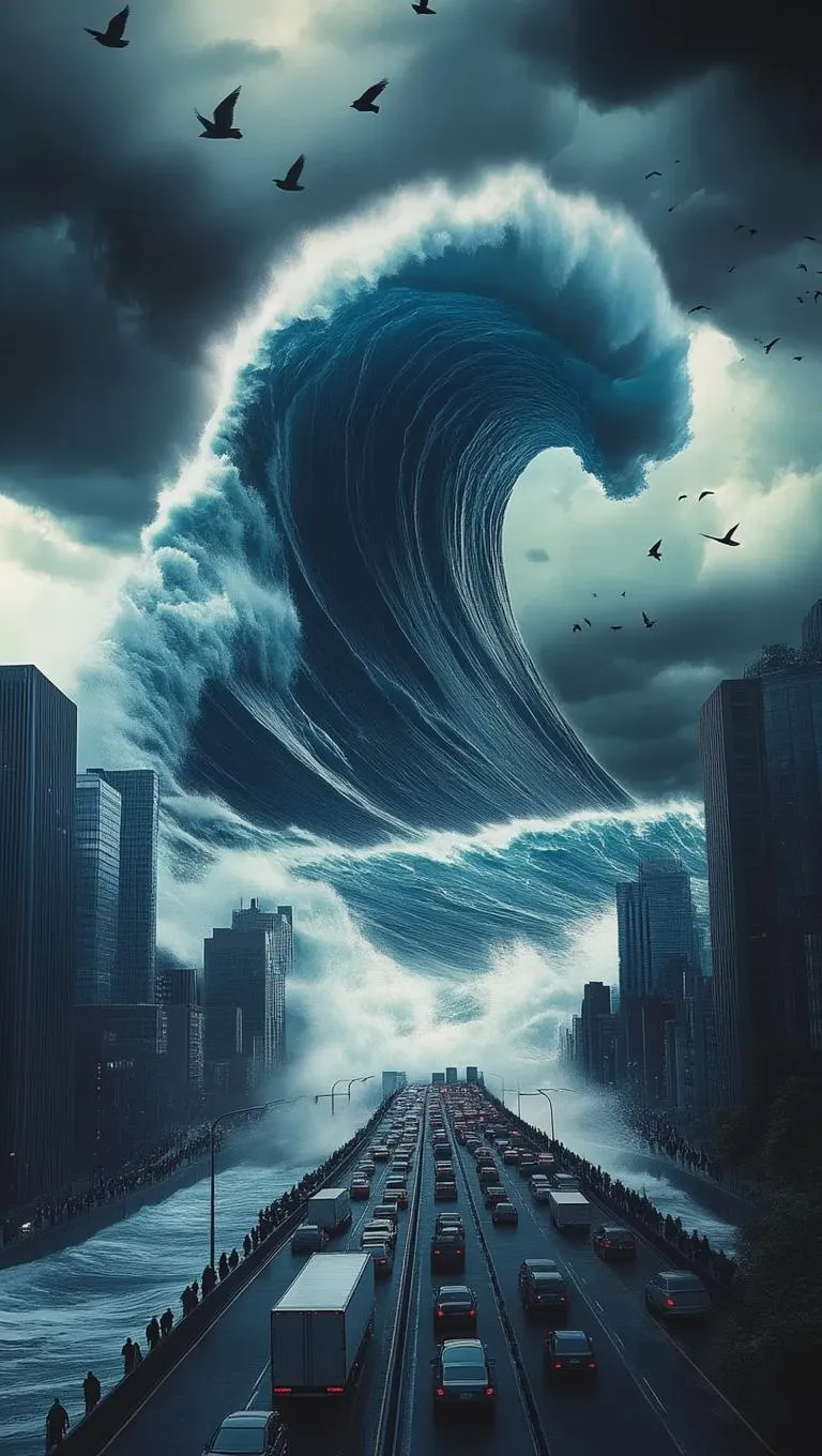 Apocalyptic tsunami wave engulfs a modern city skyline with hyper-realistic detail—dark storm clouds, submerged skyscrapers, chaotic traffic, and fleeing crowds. AI-generated cinematic scene features swirling blue waves, white foam, dramatic lighting, and eerie bird flocks. Transform prompts into professional-grade visuals with VivaGo.ai’s AI image tools for immersive, doom-filled apocalyptic storytelling.