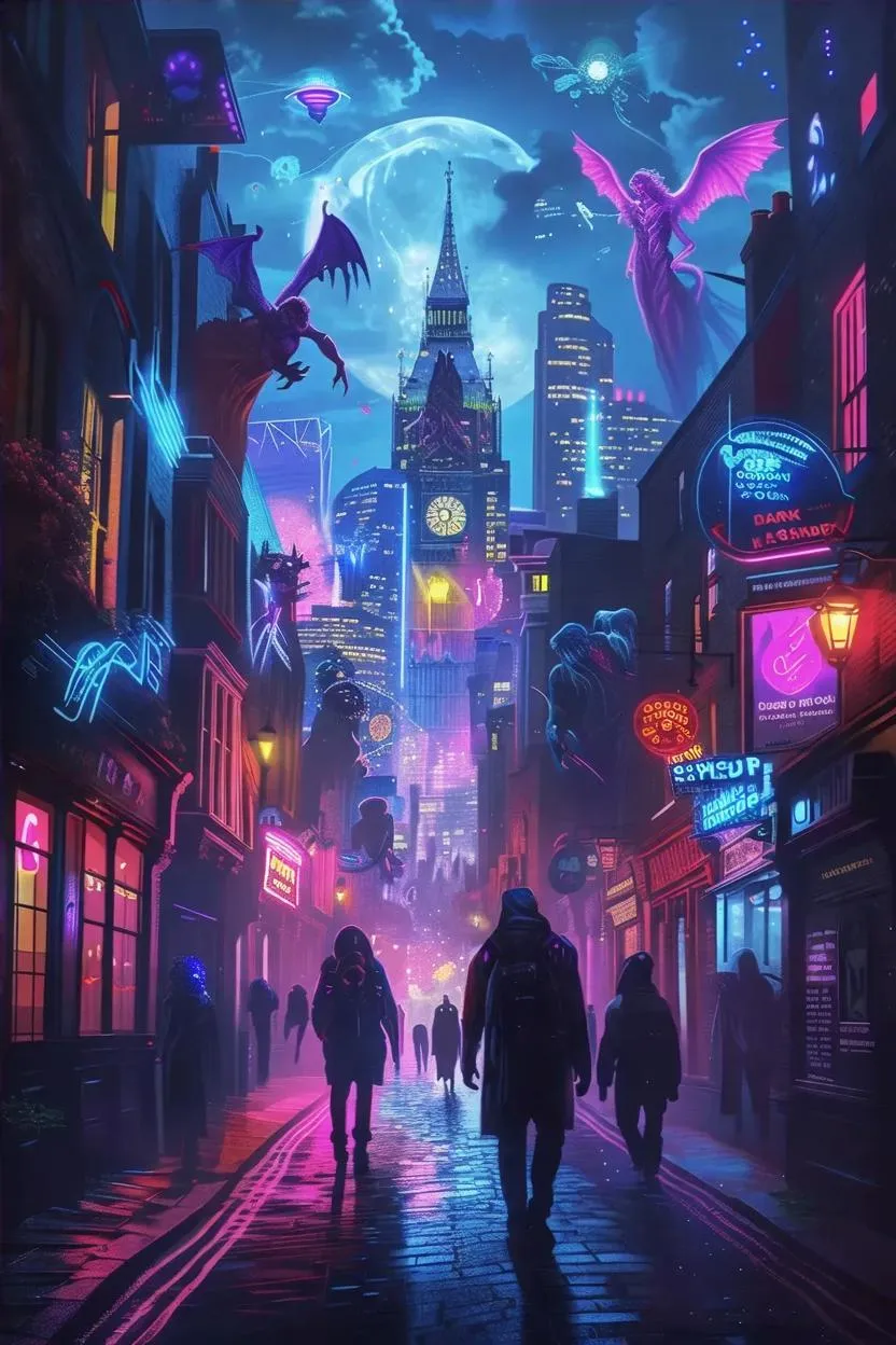 Explore London's neon-drenched cyberpunk Nightside with Vivago.ai's AI image generator. Create hyper-realistic ink paintings of mythical beings, ancient gods, and extraterrestrials coexisting under eternal moonlight. Craft surreal scenes with neon skyscrapers, rain-slicked streets, and ethereal glows using AI effects. Transform text prompts into mesmerizing, professional-grade visuals blending fantasy, sci-fi, and magic effortlessly.