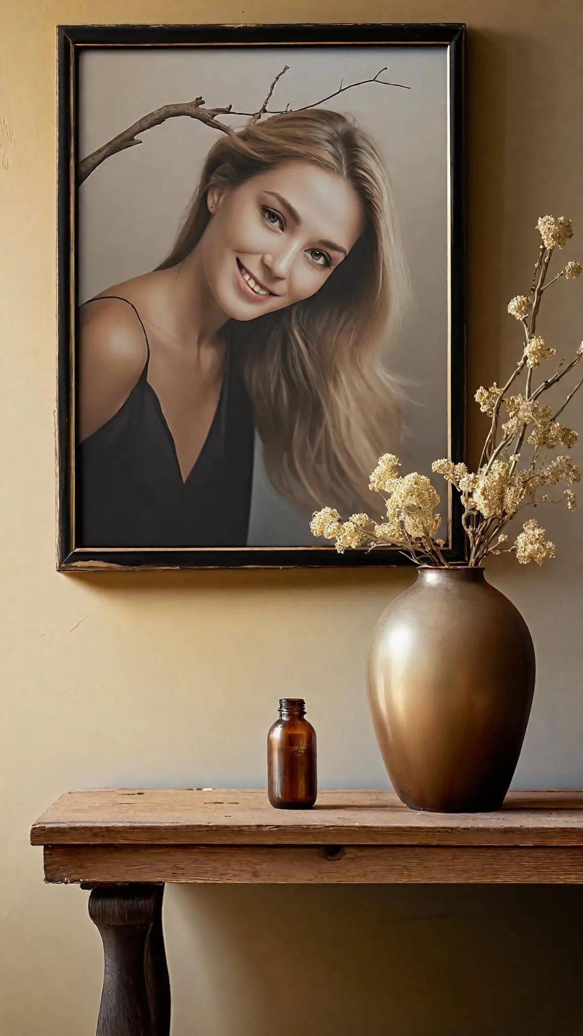 Create serene, AI-generated scenes with warm beige walls, rustic wooden accents, and minimalist decor. Perfect for cozy home ambiance visuals. Transform text prompts into nostalgic, intimate settings featuring golden-haired figures, framed memories, plush armchairs, and curated rustic-modern aesthetics. Ideal for interior design inspiration and emotional storytelling through AI-powered image generation.