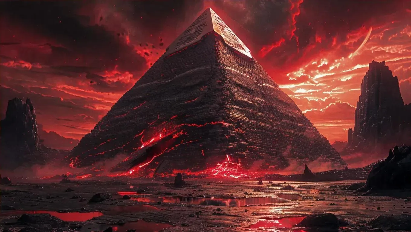 Explore AI-generated apocalyptic visuals with a dark, destroyed void scene featuring a massive floating obsidian pyramid. Edges glow thick red, creating a haunting dystopian landscape. Perfect for sci-fi and horror projects. Transform text prompts into professional-grade images using advanced AI tools from vivago.ai.