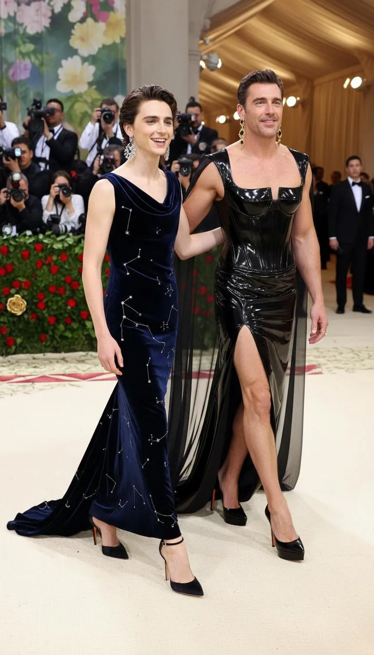Generate Timothée Chalamet and Armie Hammer walking the Met Gala red carpet in striking fashion-forward ensembles. Visualize men's skintight, sleeveless formal gowns paired with high heels and dangle earrings. Create this unique celebrity moment with VivaGo.ai's powerful AI image generation. Transform your vision into reality.