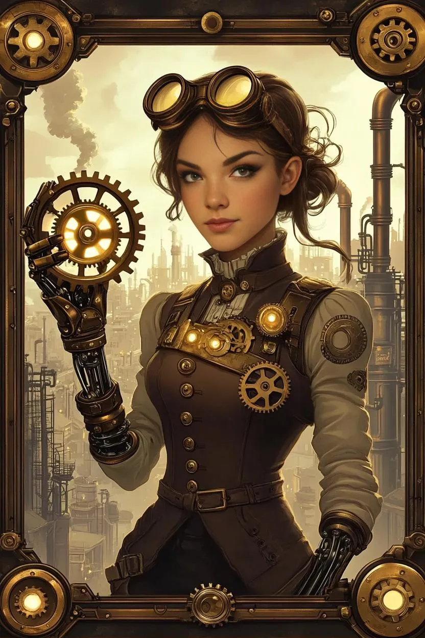 Explore a steampunk inventor girl with a mechanical arm and flying goggles clutching a glowing gear-powered device. Set against a steam-powered cityscape with brass borders, sepia tones, and intricate gears, this AI-generated scene blends vintage collectible aesthetics, warm lighting, and retro-futuristic textures for a nostalgic yet innovative vibe. Crafted by VivaGo’s AI tools for immersive visual storytelling.