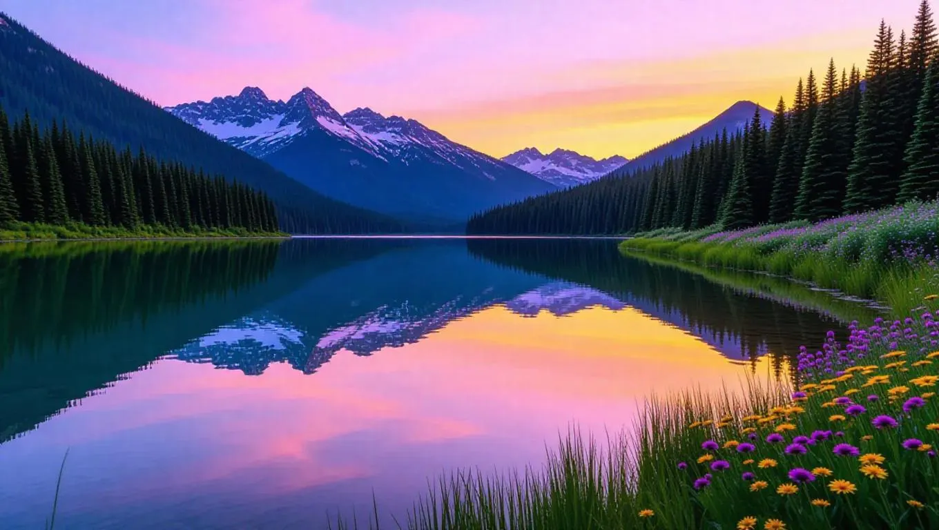 Generate serene landscapes with AI: tranquil lakes mirroring vivid sunset hues, snow-capped mountains, lush forests, and wildflower meadows. Perfect rule of thirds composition in 16:9 panoramic format for immersive, soul-soothing visuals. Ideal for AI image generation and professional editing effects.