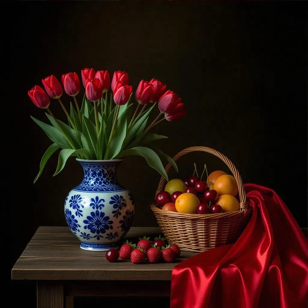 Create stunning AI-generated still life art with vivago.ai. Vibrant red tulips in a Delft blue porcelain vase contrast against dark textures, accompanied by a rustic wicker basket overflowing with fresh strawberries and cherries. Realistic chiaroscuro lighting highlights intricate details for elegant compositions. Perfect for classic ambiance visuals. #AIArt #RealisticEffects #StillLifePhotography