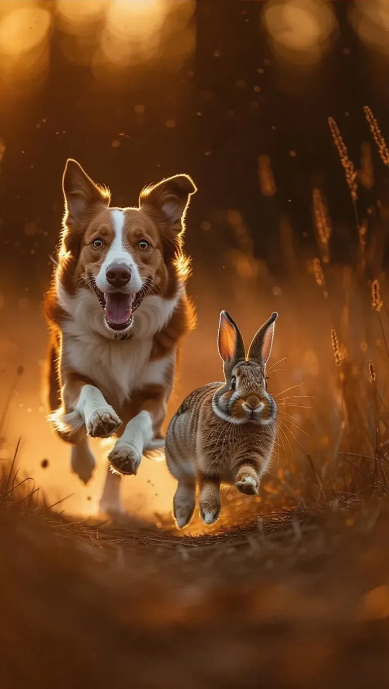 Golden hour magic illuminates a playful dog chasing a bounding rabbit through sunlit fields. Warm sunlight, softly blurred grasses, and dynamic dust particles capture joyful motion. Realism meets whimsy in this AI-generated scene, evoking freedom and connection. Vivago.ai blends vibrant action with emotional storytelling for captivating visual narratives.