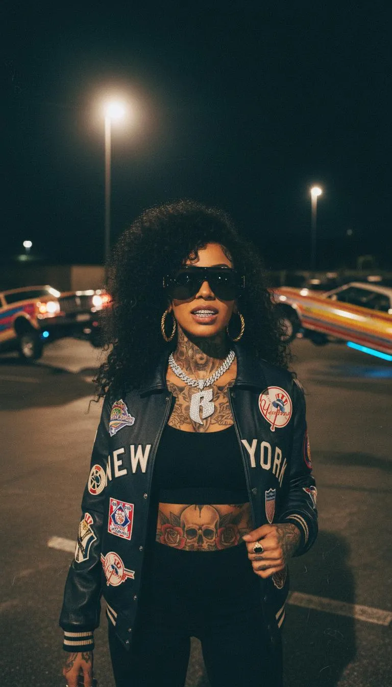 Generate AI images of a tattooed woman with intricate skull and rose tattoos, diamond grills, and bold jewelry in a vintage night scene. Capture her in a parking lot with lowrider cars, wearing an open jacket, chain pendant, and sunglasses. Create unique, edgy vintage photography art with Vivago.ai.