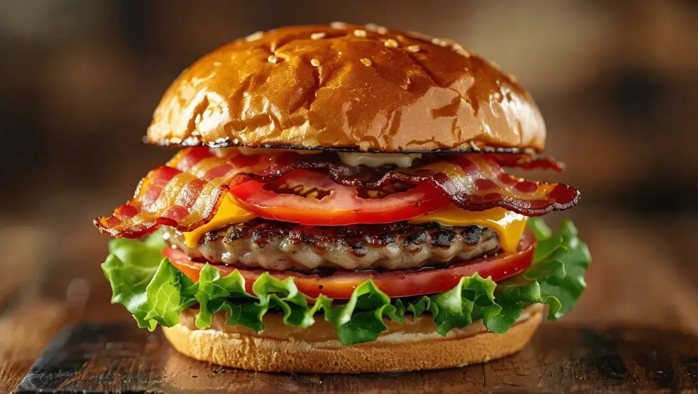 Generate a dynamic AI animation of a cheeseburger with crispy bacon, fresh lettuce, and juicy tomato layers rotating and deconstructing. Perfect for food content creators seeking eye-catching, AI-powered visual effects to showcase gourmet burgers in motion.