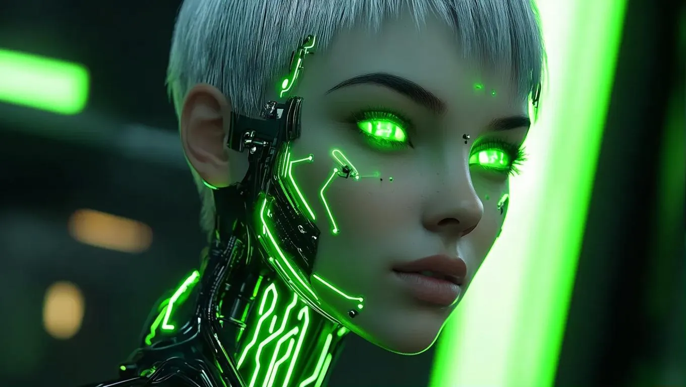 Generate a hyper-realistic AI image of a cybernetic woman with pale skin, luminous green eyes, and glowing neon circuits across her face. Featuring silver hair, biomechanical implants, and a futuristic neon-lit backdrop. Explore AI-powered creative tools for lifelike humanoid designs, sci-fi visuals, and professional-grade digital art generation.