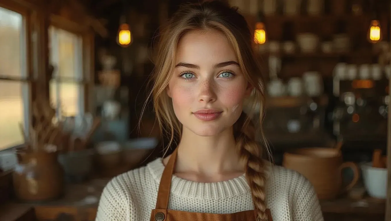 Create a cinematic AI portrait of a kind, strong young woman in rustic autumn ambiance. Featuring light-blonde braided hair, grey-blue eyes, cozy knit sweater, and flour-dusted apron outside a countryside café. Warm natural lighting, soft storytelling vibe, and earthy autumn tones for a professional-grade AI-generated image with authentic rural charm.