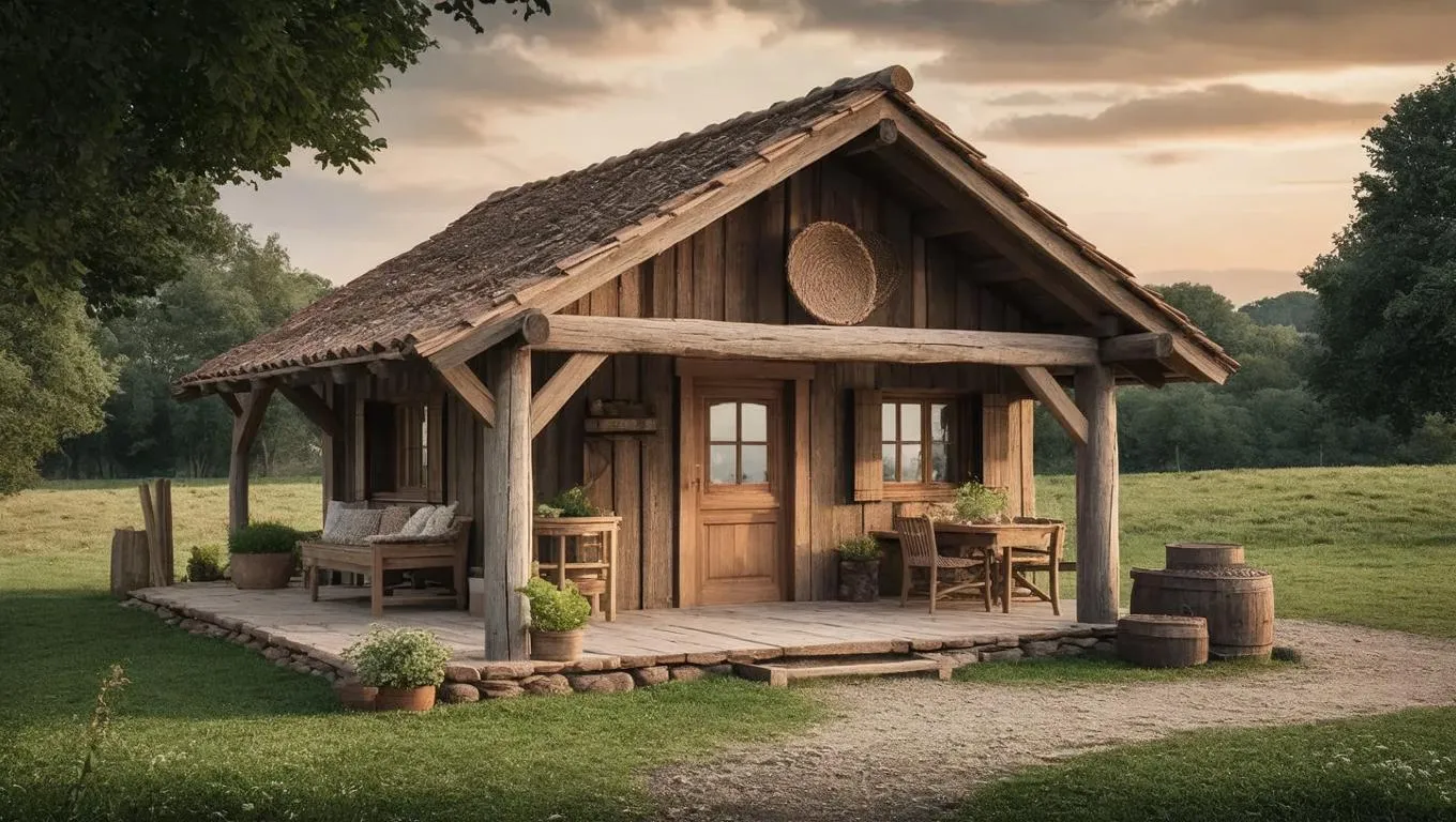 Generate a rustic carpentry workshop exterior with weathered wood textures, vintage tools, and warm lighting using AI image generation. Transform text prompts into professional visuals with curated effects for authentic woodworking charm and timeless, cozy craftsmanship aesthetics.