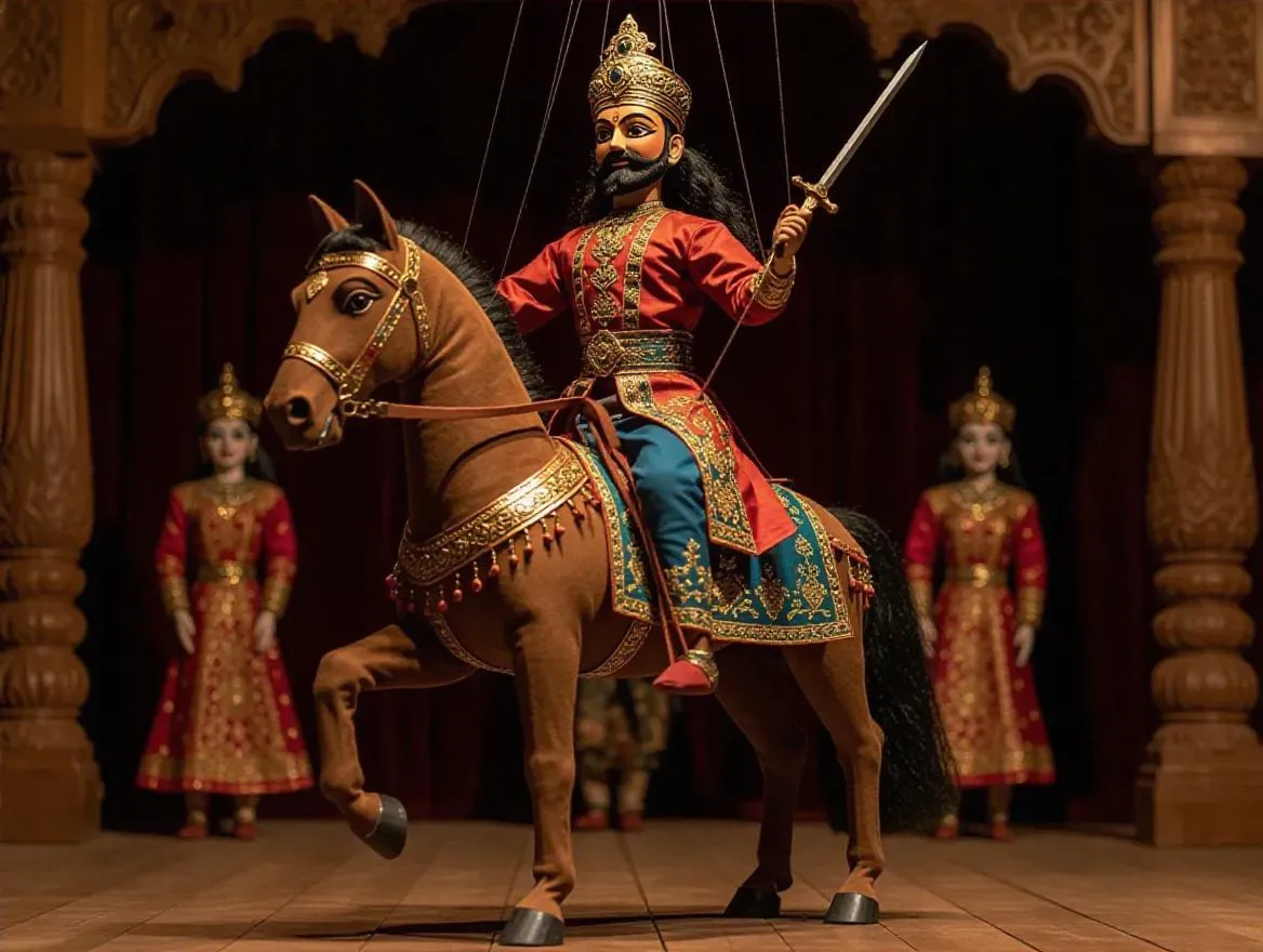 Experience AI-generated Indian puppet shows with intricate marionette craftsmanship. Vibrant earthy tones, ornate embroidered robes, and wooden horse settings bring traditional kings to life. Explore dynamic theater scenes where fabric puppets glow under masterful string control, blending rich cultural motifs with AI-powered creativity for professional visual storytelling.