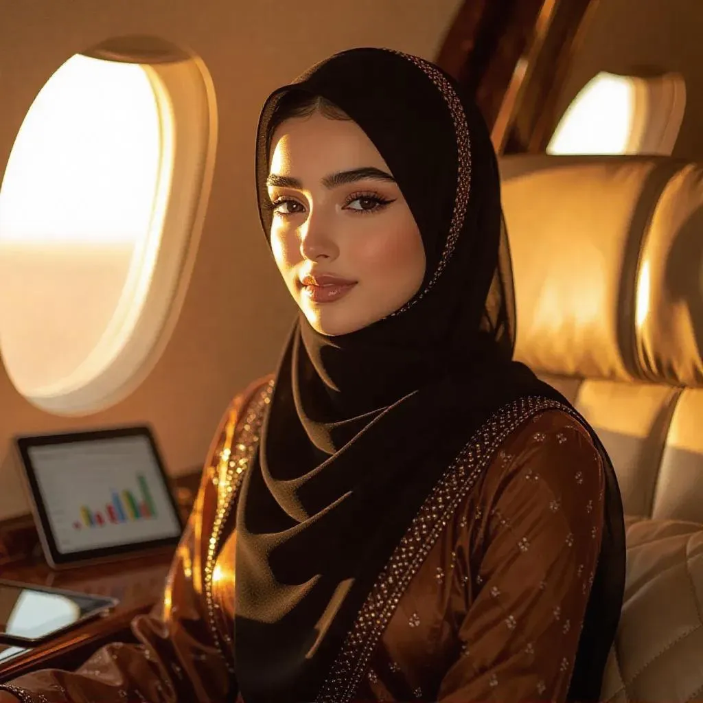 Empower your visuals with AI-generated elegance: a poised young Muslim billionaire in a luxury jet, sunset glow highlighting her modest designer attire and chic hijab. Vivago.ai crafts inspiring imagery of success—sleek accessories, business charts, and thoughtful ambition, blending grace, intelligence, and opulence. Perfect for modern, aspirational branding.