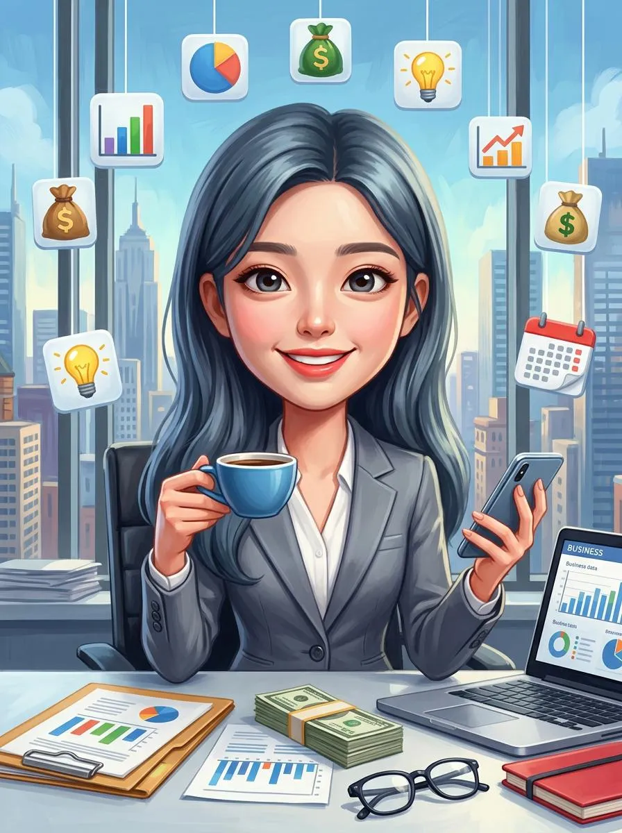 Transform photos into vibrant 3D oil paintings. Generate confident professionals in a modern office setting, holding coffee & phone, surrounded by success symbols (laptop, cash, charts). Features cartoon-like proportions (1:3 ratio), exaggerated heads & business attire against a detailed cityscape. Achieve bright, high-resolution, professional commercial artwork with AI.