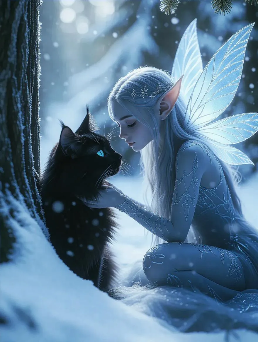 A goblin tenderly caresses the cat's face, in a moonlit winter forest. A delicate snow fairy with translucent wings and shimmering silver hair hovers, her bare feet above fresh powder. Beside her, a sleek black cat with glowing blue eyes curls around an ancient frost-covered oak tree. Soft snowflakes swirl, catching the ethereal glow of bioluminescent ice crystals. Quiet magic radiates, with misty breath visible, and faint auroras dance through pine needles. Cinematic wide shot, shallow depth of field, hyper-detailed fur textures, fairy's iridescent skin, soft bokeh from floating ice, cool indigo and pearl tones, warm lantern light through distant trees.