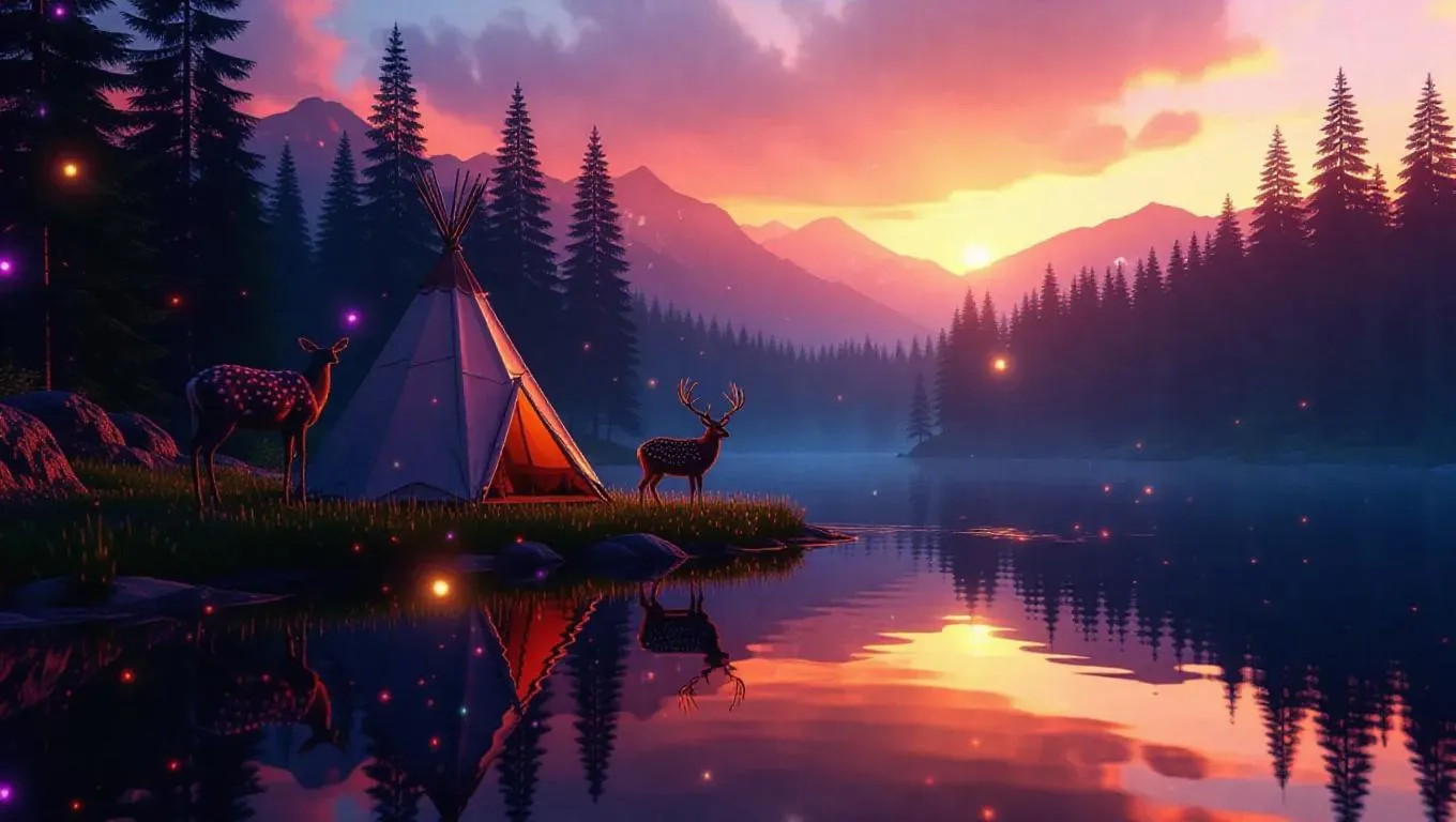 Create enchanting AI-generated visuals of a deer surrounded by magical colorful sparkles near a teepee by a serene lake amidst pine trees. Transform text prompts into vivid, professional-grade imagery with VivaGo.ai's advanced AI effects and editing tools.