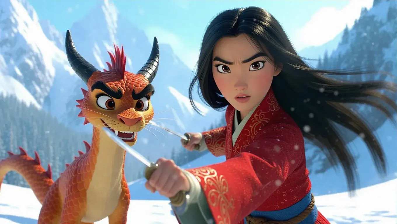 Vivid AI-generated art of Mulan training with Mushu in snowy mountains, blending cool icy landscapes with warm-toned determination. Experience dynamic contrast between fierce expressions and serene backdrops through AI-powered visual storytelling. Perfect for fantasy scenes, character design, or epic adventure themes.