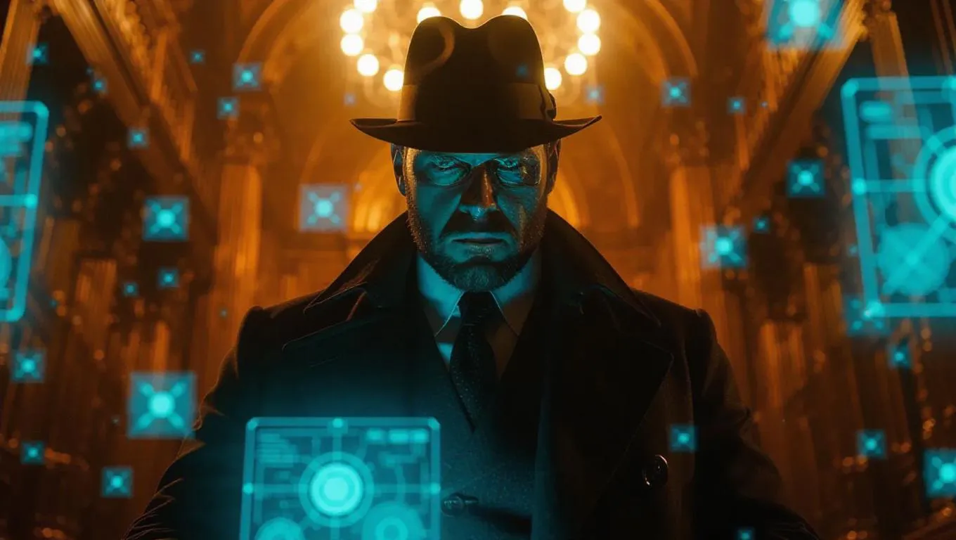 A rugged adult Detective Conan, with a rugged beard and a cigarette, investigates urban corruption in a dark, neon-lit city council chamber. High-tech clues float on holograms, casting a confusing glow. The chamber's austere, governmental design contrasts with Conan's worn, determined expression. Soft, cool amber and gold lights highlight the technology, while hard, warm shadows emphasize his intense focus and the drama of the scene. The style is a blend of noir and political thriller, capturing both the gritty realism and the tense environment.