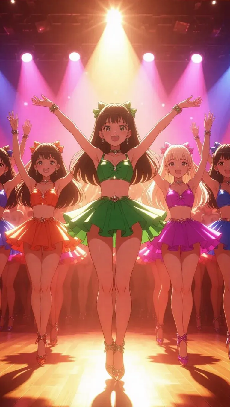 In a 1990s anime-style scene, magical girls perform a synchronized dance at a talent show. The girls, with their colorful outfits and sparkling accessories, move in perfect unison under radiant lights. The audience cheers enthusiastically, and the characters display exaggerated, comedic expressions in their performances. The stage is illuminated with warm, inviting lighting, creating a lively and humorous atmosphere.
