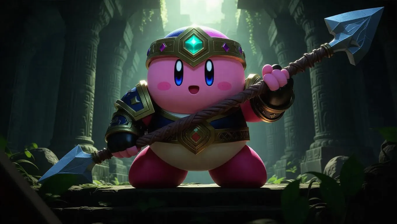 Kirby, reimagined as an ancient guardian, dons stone-like armor that radiates with an ancient power. He holds a mighty spear, his eyes burning with purpose. Floating above a long-lost civilization, crumbling structures and wild vines surround him, adding to the atmospheric mystery. Behind him, towering stone pillars stand, their intricate carvings casting an enigmatic glow across the forgotten land. The scene is highlighted by dramatic, shadowy lighting, emphasizing the intense contrast between Kirby's commanding stature and the decay below. The style is a blend of fantasy and history, creating a visually powerful and immersive image.