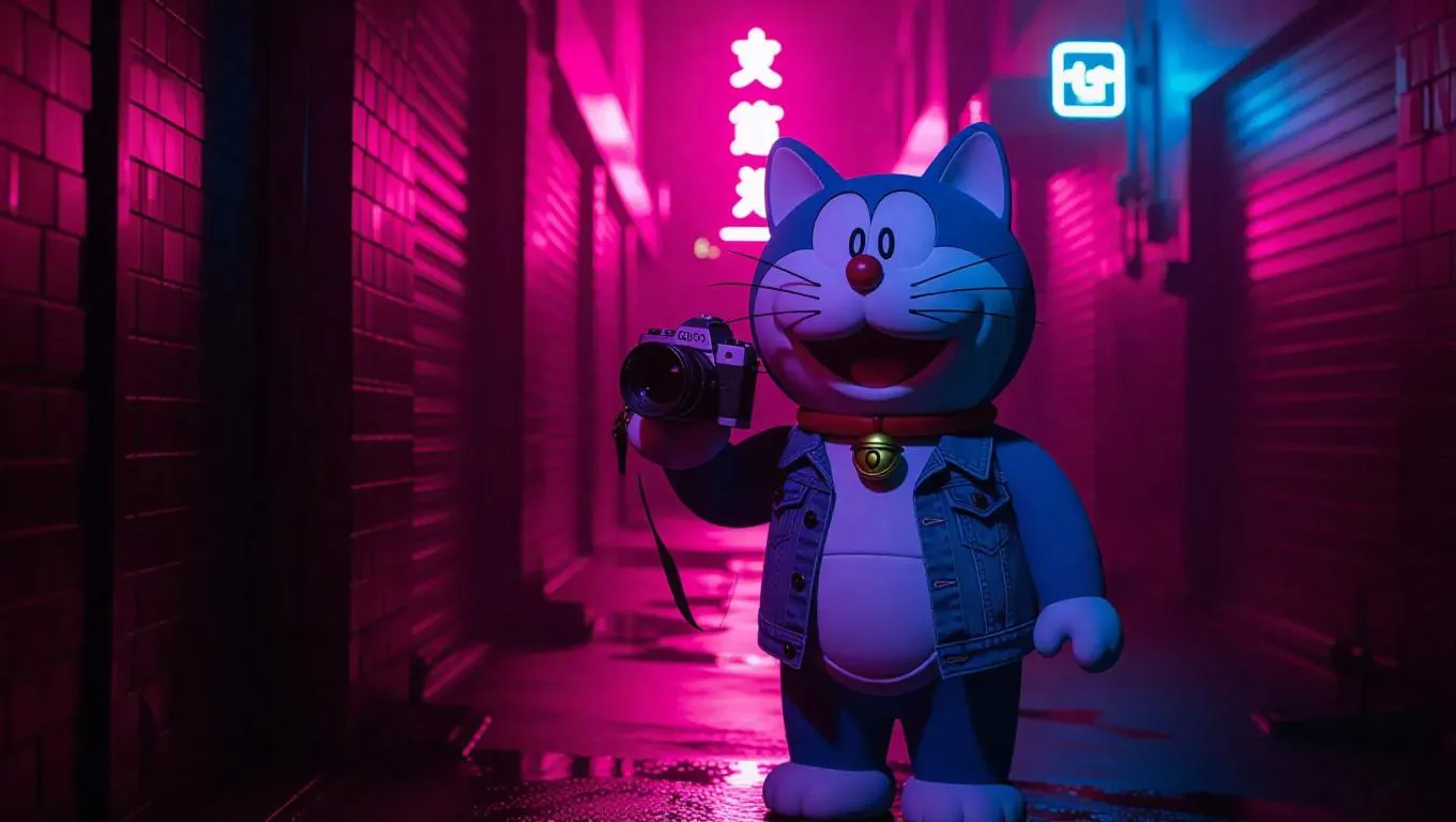 Doraemon, reimagined as a noir sleuth, finds himself in a deserted alley of 1960s Los Angeles. He wears a casual button-down shirt and denim jacket, casually holding a camera. His gadget pouch now features unusual, glowing relics. The moody lighting casts stark shadows that embody the noir atmosphere. Neon lights provide a vibrant contrast to the darkness, enriching the mystery of the scene. This blends California vibes with noir aesthetics seamlessly.