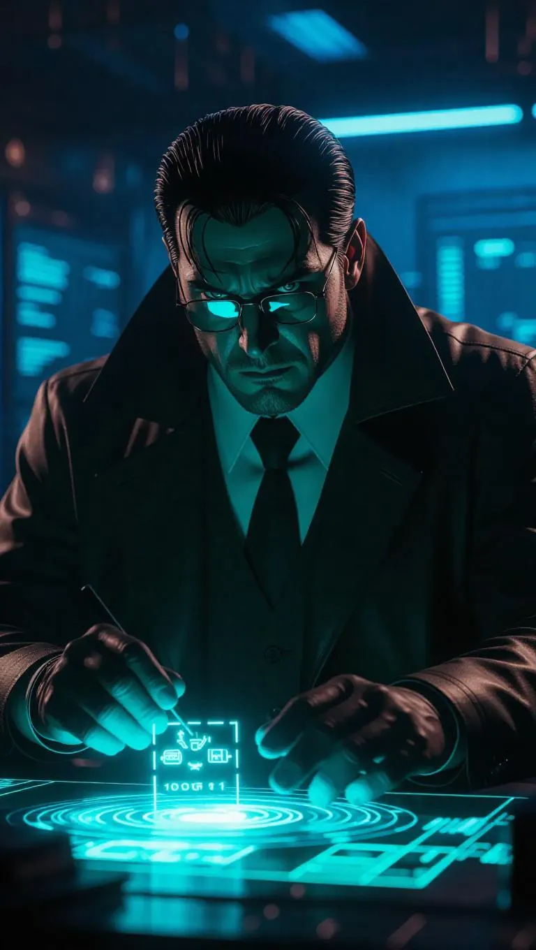 A rugged adult Detective Conan, with stubble and a cigarette, investigates a cybercrime ring in a dark, neon-lit lab. High-tech clues float on holograms, casting an eerie glow. The lab's sleek, futuristic setup contrasts with Conan's worn, determined expression. Soft, cool blue and green lights highlight the technology, while hard, warm shadows emphasize his intense focus and the tension of the scene. The style is a blend of noir and cyberpunk, capturing both the gritty realism and the futuristic elements.