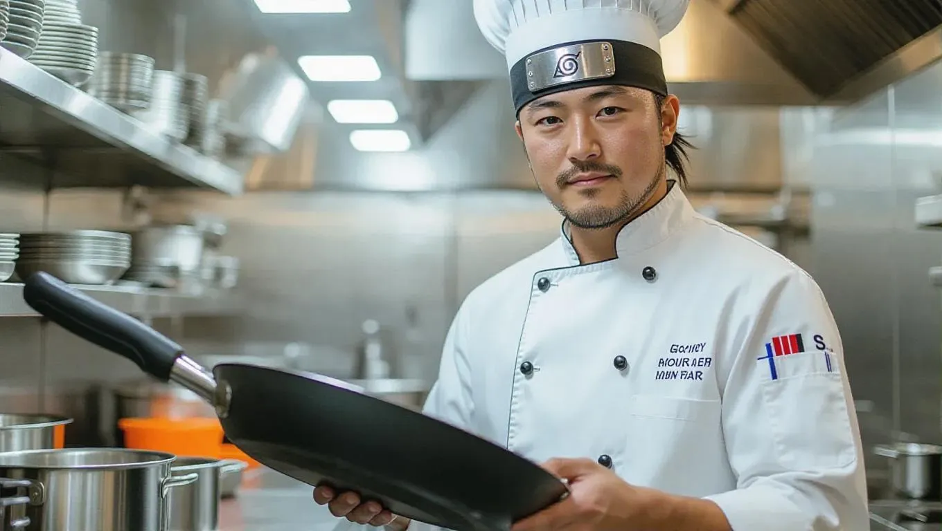 Naruto, a gourmet chef in a trendy kitchen, wears a chef's jacket and holds a frying pan. His ninja headband has been replaced by a white toque. The bright overhead lights create an energetic vibe, reflecting off the stainless steel appliances, adding a bustling tone to the culinary scene. The style is dynamic, capturing the fast-paced kitchen atmosphere.
