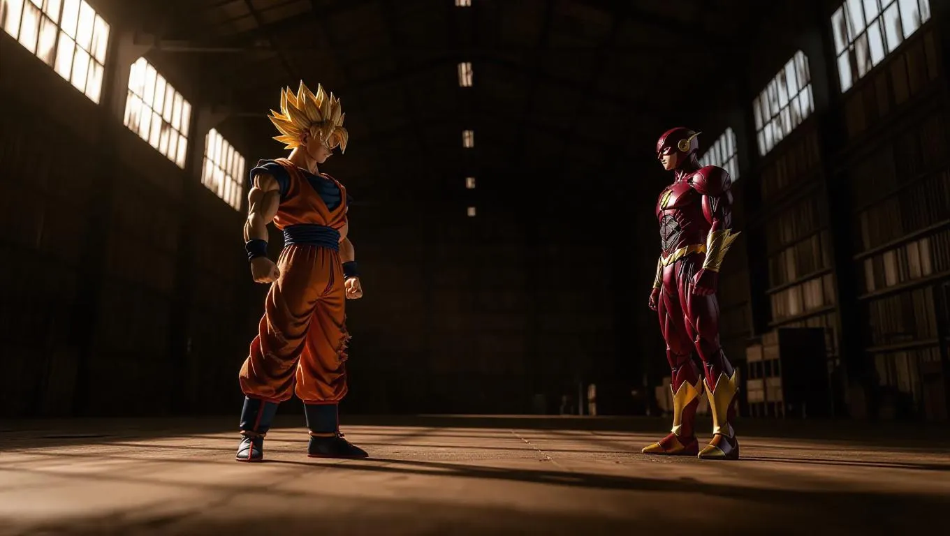 Goku in Super Saiyan Third Form stands in a dark, abandoned warehouse, his golden hair glowing ominously. He gazes intently at The Flash, who stands confidently nearby. The warehouse is dimly lit with flickering overhead lights, casting stark shadows and highlighting the rusted metal. The sky is invisible above the building. The lighting is gritty and atmospheric, creating a deep contrast between highlights and shadows. The style is hyper-realistic, emphasizing the muscular physiques and determined expressions of both characters.
