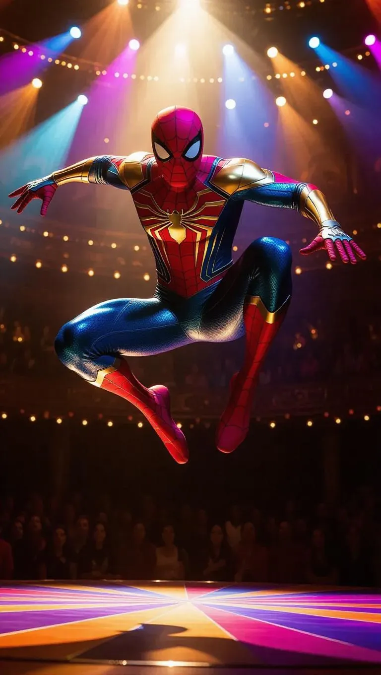 Spider-Man, dressed in a shiny, gold circus outfit with a silver mask, performs a mid-air flip on a colorful stage. His muscles are taut, capturing the dynamic tension of his leap. The theater is adorned with bright colors and dazzling lights, creating an elegant backdrop. Dramatic spotlights cast a mix of vivid and soft hues, highlighting his form and casting long shadows, enhancing the theatricality of the scene. The style blends the realism of Spider-Man's superhero physique with the excitement of circus performance.