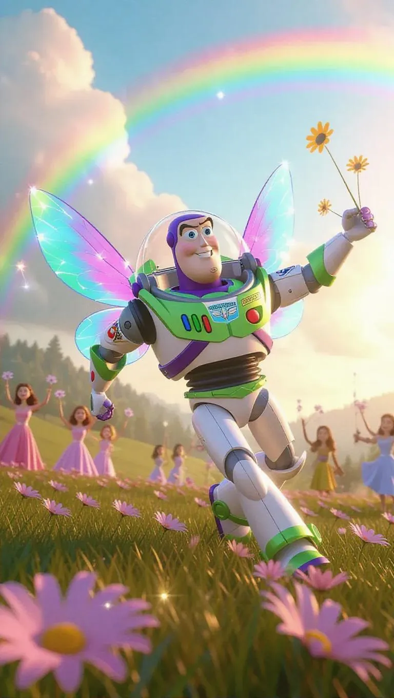 Buzz Lightyear, adorned in whimsical fairy attire, flits through a blooming meadow, preparing to engage in a playful duel with another fairy in a magical competition. His costume features a distinctive star emblem, and his wings flutter dramatically with each swift movement. Fellow fairies cheer with delight, waving wands and flowers from the grass. A sparkling rainbow arcs in the background, its vibrant colors enhancing the enchanting atmosphere. Sunlight dances in the sky, casting shimmering highlights on the fairies and the meadow, creating a scene of fantasy and joyous play.