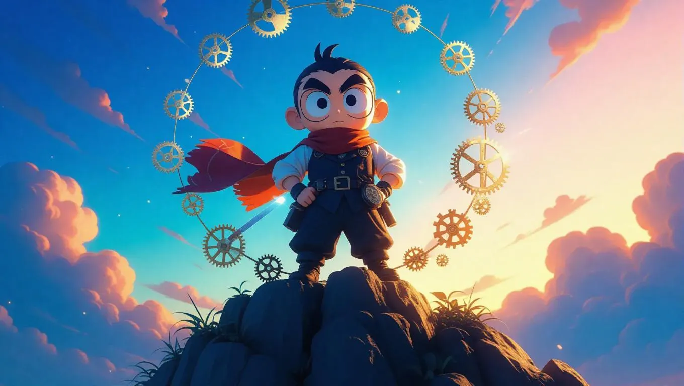 Shin Chan, transformed into a charming clockmaker, stands valiantly on a rugged cliff. He wears a vest with many pockets and a stylish scarf, his determined expression illuminated by the glow of his enchanted sword. The magical sky above is filled with floating gears and cogs, bathed in soft, warm light that casts gentle shadows and highlights. The scene is rendered in a high-fantasy style, with vibrant colors and meticulous detail, capturing the ethereal beauty of the moment.