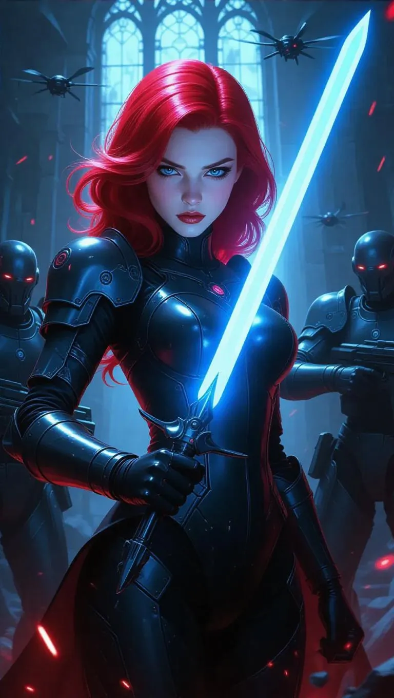 Snow White, in a cyberpunk style, wields a futuristic energy sword, her fierce expression aimed at overthrowing a robotic overlord. Her vibrant red hair contrasts with her pale complexion, and she dons a high-tech, armored bodysuit. Mechanical dwarves equipped with laser shields flank her, prepared for combat. The backdrop shows a derelict castle, with shattered walls and electronic debris scattered throughout. Drones dart above, casting dark shadows. A blend of bright neon lights highlights Snow White, while harsh blue beams from the drones create a sense of urgency. The aesthetic merges modern technology and classic fairy tale motifs.