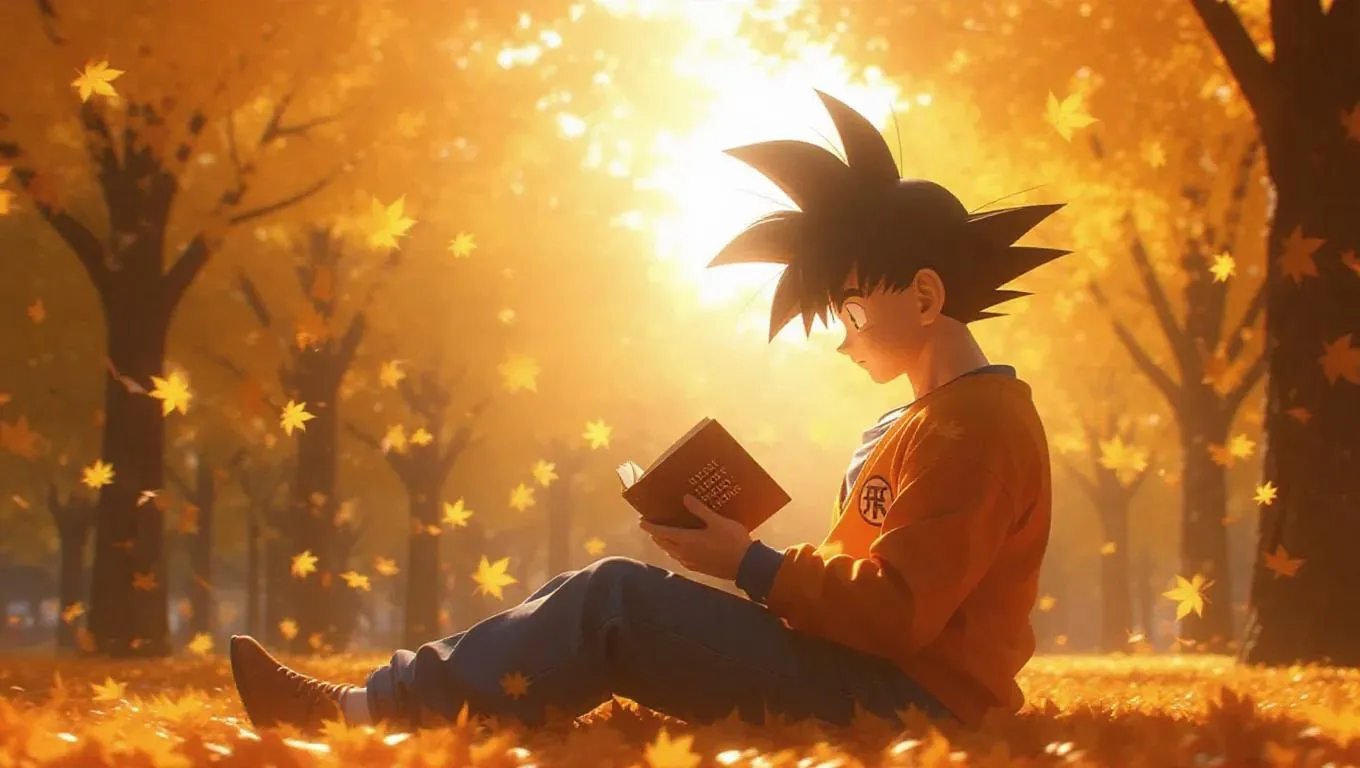 Goku, wearing a cozy sweater and jeans, enjoys a peaceful day in a serene park filled with autumn leaves. His eyes are soft, and his expression is reflective, appreciating nature's beauty. The golden leaves falling create a tranquil atmosphere, with soft sunlight filtering through the branches. The light is warm and mellow, enhancing the calmness of the moment. The scene is rendered in a comforting style, celebrating the joys of simplicity.