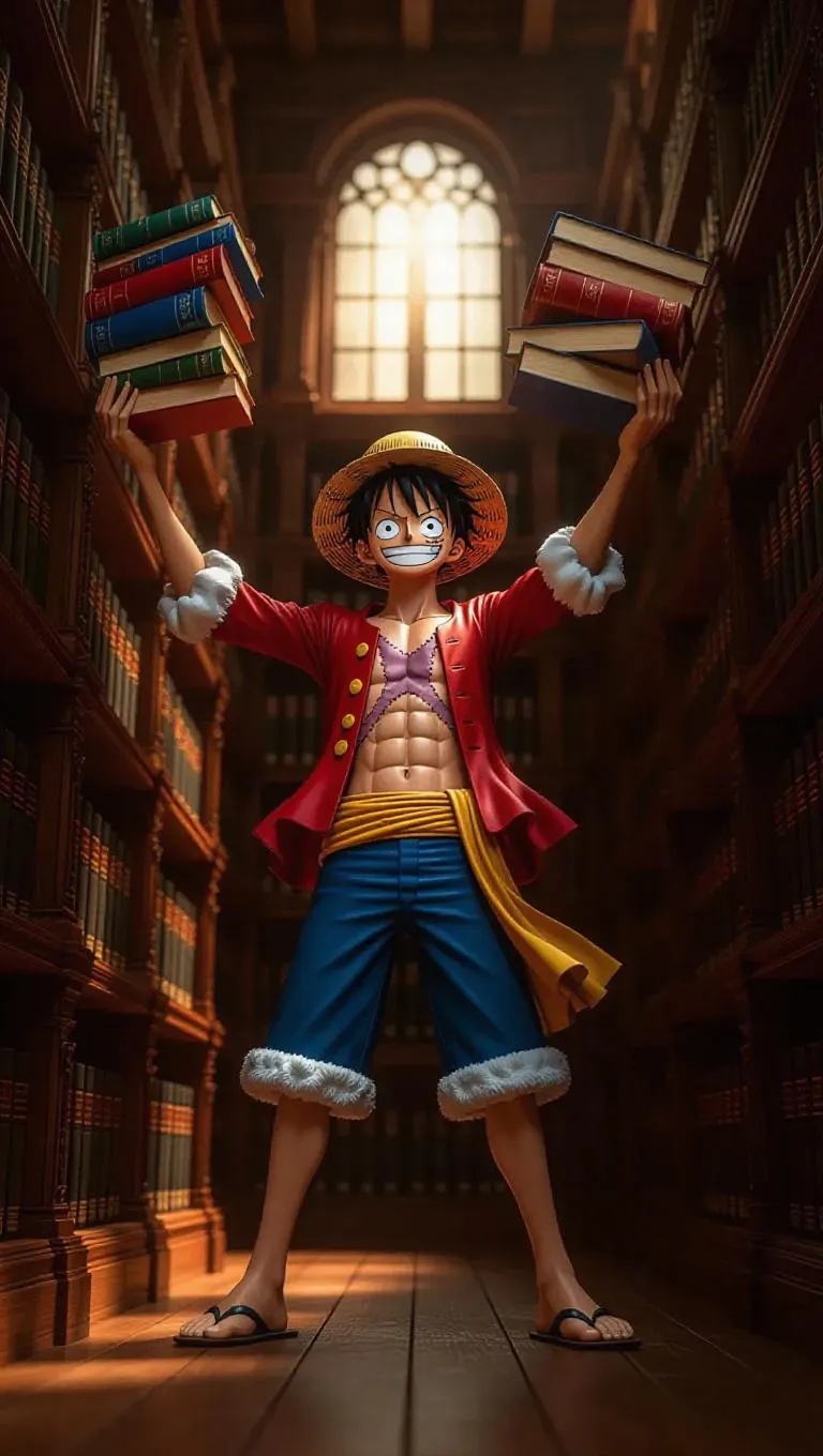 Luffy from One Piece, dressed in a superhero outfit, stands amidst towering bookshelves in a grand library. He is energetically organizing books, his expressive face showing a mix of concentration and excitement. The warm, ambient lighting casts soft shadows, highlighting the rich wooden shelves and the intricate architectural details. The scene exudes a cozy, inviting atmosphere, blending the whimsical charm of Luffy with the timeless elegance of a classic library.
