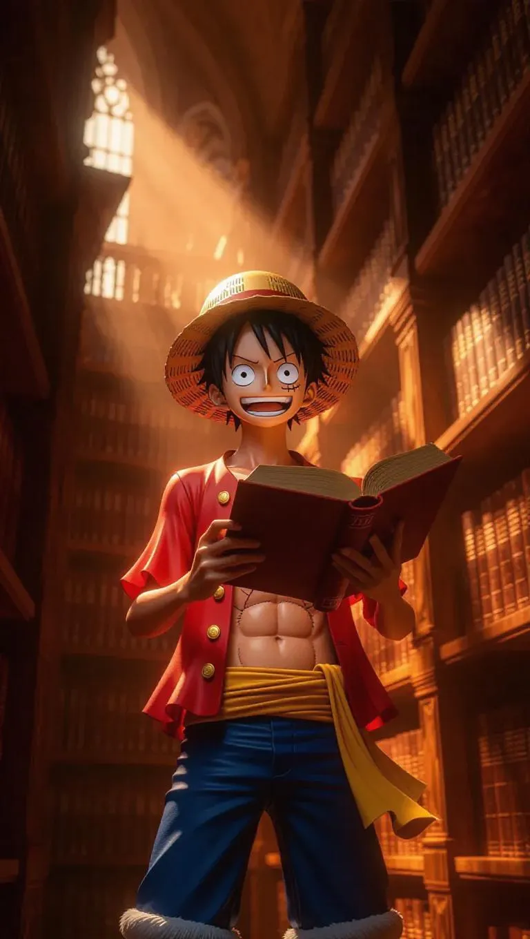 Luffy from One Piece, wearing gym attire, stands amidst towering bookshelves in a grand library. He is energetically organizing books, his expressive face showing a mix of concentration and excitement. The warm, ambient lighting casts soft shadows, highlighting the rich wooden shelves and the intricate architectural details. The scene exudes a cozy, inviting atmosphere, blending the whimsical charm of Luffy with the timeless elegance of a classic library.