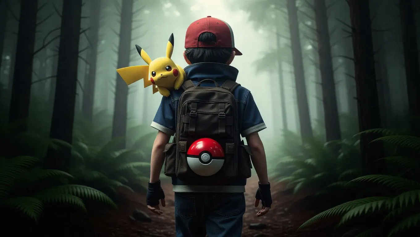 Ash Ketchum, an aged Pokémon trainer, walks through a post-apocalyptic forest, his torn cap and loosely hanging Pokéball belt reflecting his weary journey. A robotic Pikachu perches on his shoulder, its metallic surface gleaming faintly. The forest is shrouded in a misty atmosphere, with muted colors and dim, diffused light filtering through the dense canopy, creating a somber and eerie ambiance. The scene is rendered in a realistic style, emphasizing the desolate and haunting beauty of the environment.