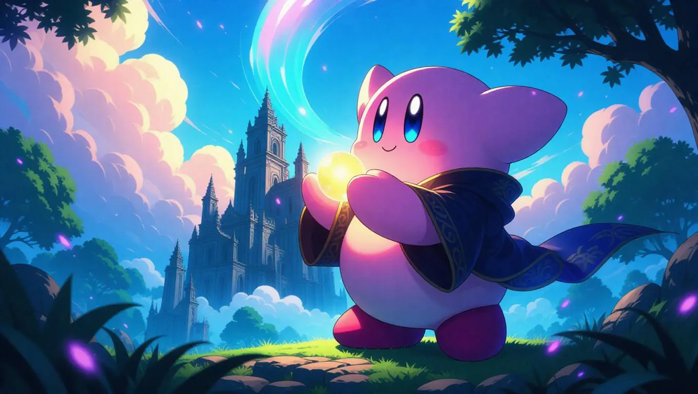 Kirby, reimagined as a wise sage, dons simple yet elegant robes that flutter in the gentle breeze. He holds a glowing orb, his eyes filled with insight. Floating above a mystical valley, swirling clouds and ethereal lights surround him, adding to the tranquil atmosphere. Behind him, ancient ruins rise, their stones glowing softly in the evening light. The scene is saturated in gentle, ambient lighting, emphasizing the peaceful contrast between Kirby's profound nature and the mysterious landscape below. The style is a mix of fantasy and introspection, creating a visually serene and contemplative image.