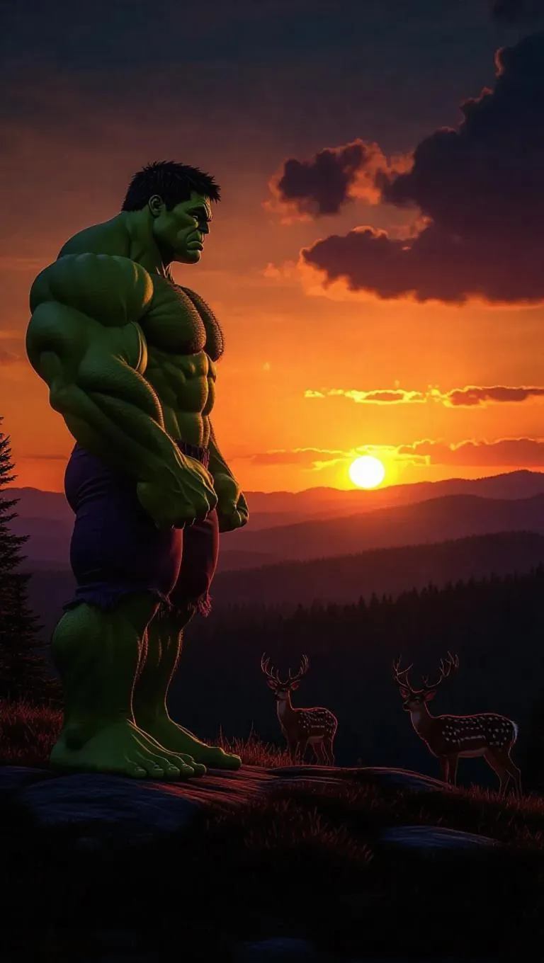 Hulk, a towering green giant with a thoughtful look, stands on a scenic hilltop, watching a sunset. His muscles are relaxed, and his eyes convey reflection. Deer graze peacefully in the distance, enriching the serene wilderness vibe. The sky above is ablaze with oranges and purples, with a few soft clouds. The fading light creates long shadows, illuminating Hulk's green skin and the rolling landscape. The style is realistic, accented with whimsical fantasy.