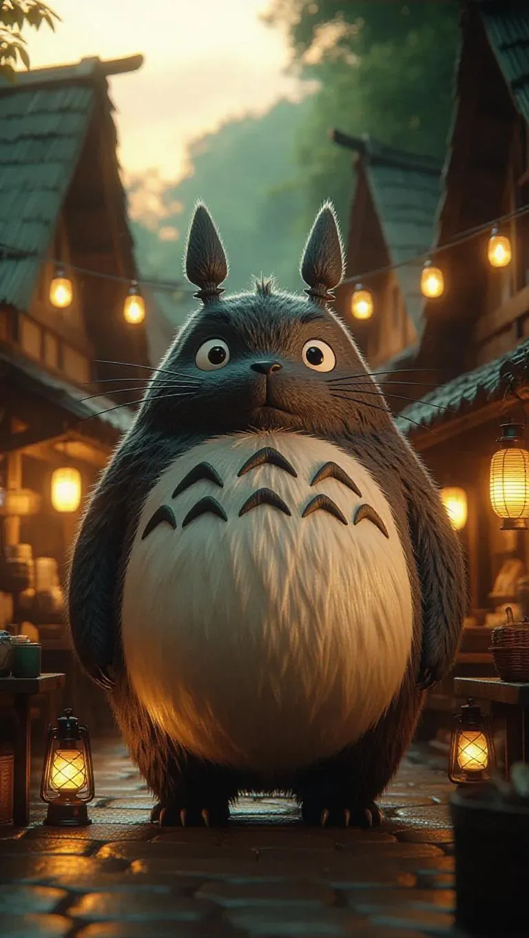 Totoro stands tall amidst a medieval village, his large, furry body dwarfing the thatched-roof cottages. Lanterns flicker around him, casting warm shadows, while colorful market stalls add a bustle of activity, bathing the scene in rich, earthy tones. Totoro's eyes glint with friendliness, his whiskers twitching as he observes the cheerful townsfolk. Golden light from the setting sun highlights his gentle expression, creating a charming blend of fantasy and tradition. The style is a fusion of realistic and fairy tale, emphasizing the enchanting yet historical atmosphere.